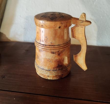 Mugg av trä med handtag och lock. Muggen har en hel del inristningar.