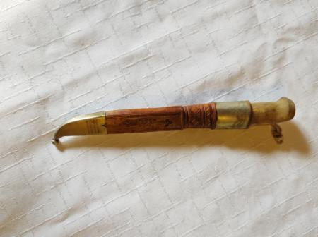 Liten söndrig kniv med ett elegant läderfodral.