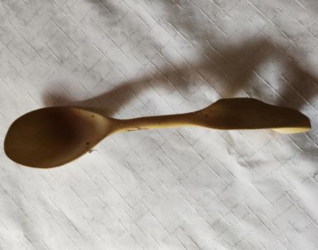 Slev gjord på trä med intressant handtag.