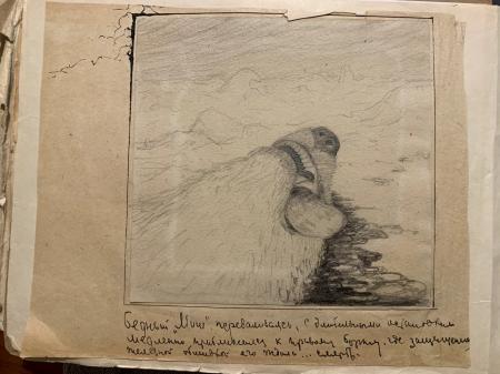 Texten: Stackars Misha (smeknamn för björn) tumlande, långsiktigt utmattad, närmar sig långsamt styrbordet, var skyddad med järnpläteringen vad som väntade på honom... Döden.