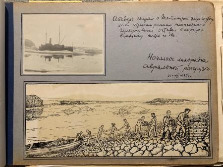 Texten uppe till höger: Isberget spelade "Taymyr" ett grymt skämt. 21-... under de tidiga morgontimmarna plötsligt slog runt och lämnade en två meter stor buckla i skrovet.